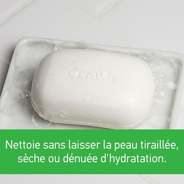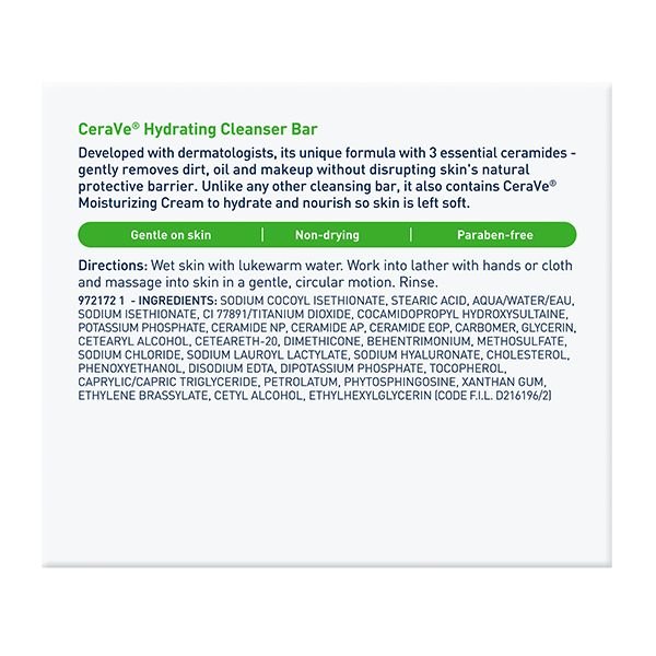 Développé avec des dermatologues, le Pain Nettoyant Hydratant CeraVe nettoie et hydrate sans altérer la barrière protectrice de la peau. Sa texture crémeuse et moussante, aux 3 céramides essentiels et à l’acide hyaluronique, contient 5% de crème hydratante CeraVe qui assure l’hydratation tout en éliminant les impuretés, l’excès de sébum et le maquillage pour une peau plus douce.