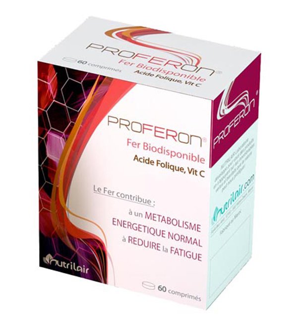 Proferon Fer Biodisponible de Nutrilair est un complément alimentaire Fer à base de spiruline enrichie en Fer, et de Vitamines B9 (Acide Folique), et C (issue d’un Extrait de Baies d’Acérola).